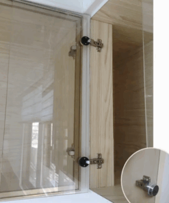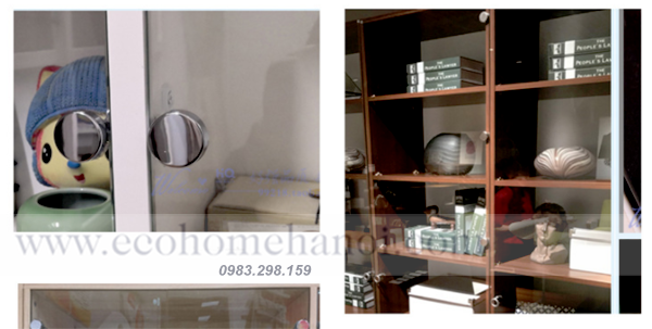 Cách lắp: Khi đóng cửa, cánh kính nằm lọt thỏm bên trong khung tủ. Cạnh vách tủ lộ ra hoàn toàn.