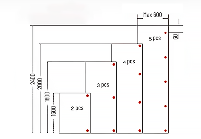 Cách lắp: Khi đóng cửa, cánh kính chỉ che phủ 1/2 cạnh vách tủ (độ phủ khoảng 8-9mm).