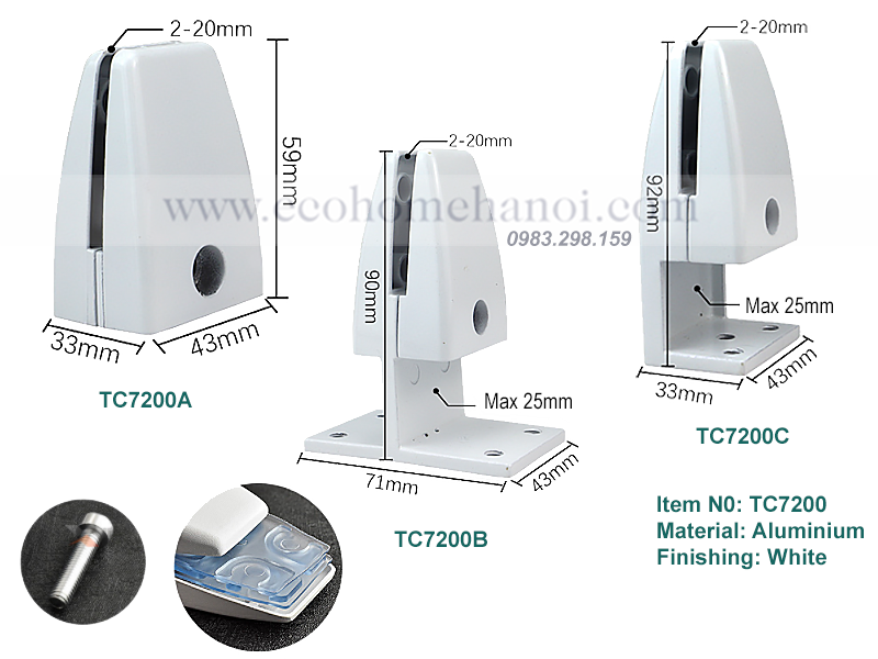 | Phụ kiện đi kèm | 01 Thân kẹp, 02 Đệm cao su/Silicon, 01 Bộ ốc siết |
