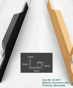 Tay nắm âm CH.8017 là mẫu tay nắm tủ hiện đại dạng thanh dài, thiết kế kẹp mép cánh tủ, kết hợp cùng nẹp bo cạnh đồng màu, mang đến giải pháp vừa đẹp mắt, vừa bền chắc cho nội thất tủ cao cấp. Chất liệu hợp kim nhôm phủ sơn tĩnh điện bền màu, cùng nhiều kích thước linh hoạt giúp thi công thuận tiện, phù hợp nhiều dạng tủ khác nhau.
