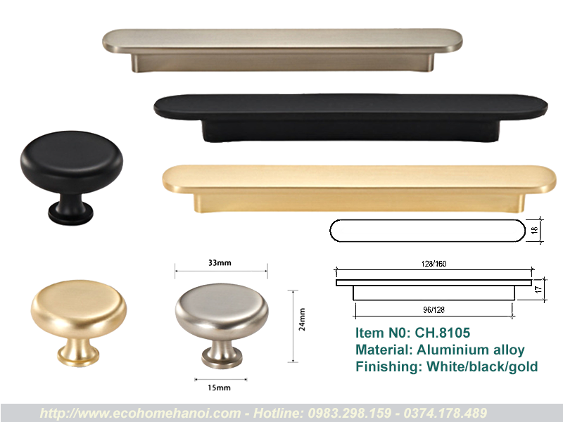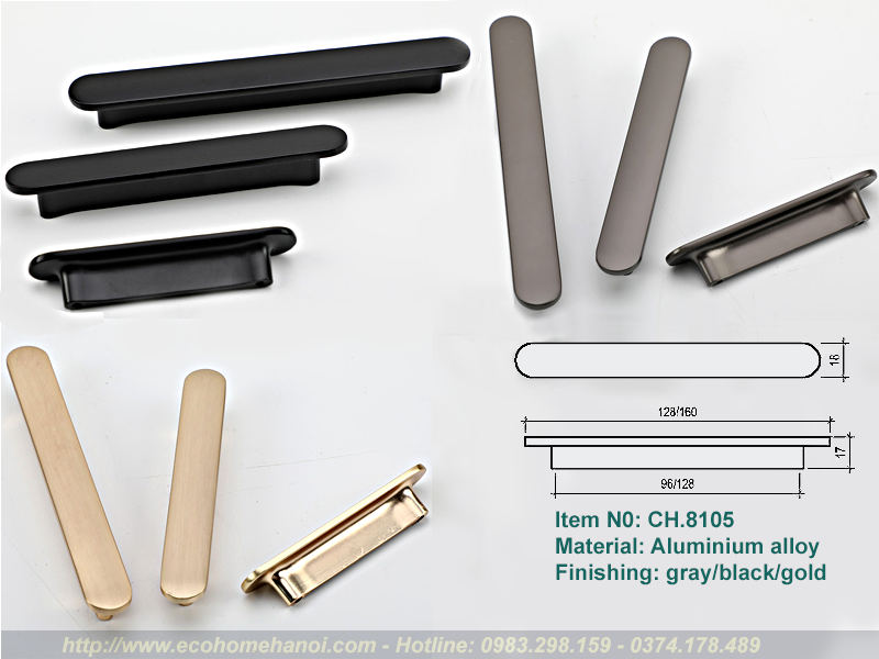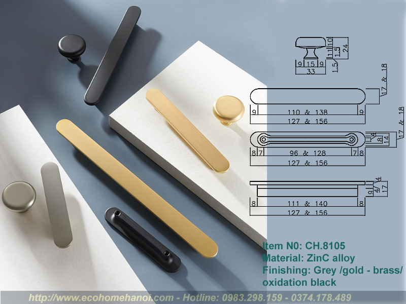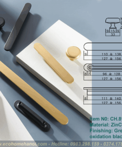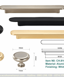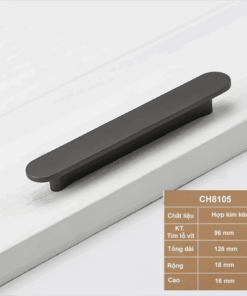 CH.8105 có cấu trúc gồm một thanh ngang (tay cầm) đặt trên hai chân đế hình trụ, tạo thành hình chữ T (hoặc chữ H kéo dài). Cấu trúc này loại bỏ hoàn toàn các chi tiết rườm rà, mang lại vẻ ngoài gọn gàng, thanh thoát. Khi lắp lên cánh tủ, nó không chiếm quá nhiều “không gian thị giác”, giúp tôn lên vẻ đẹp của màu sơn tủ hay vân gỗ tự nhiên.