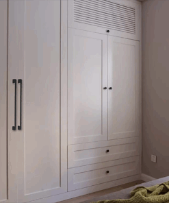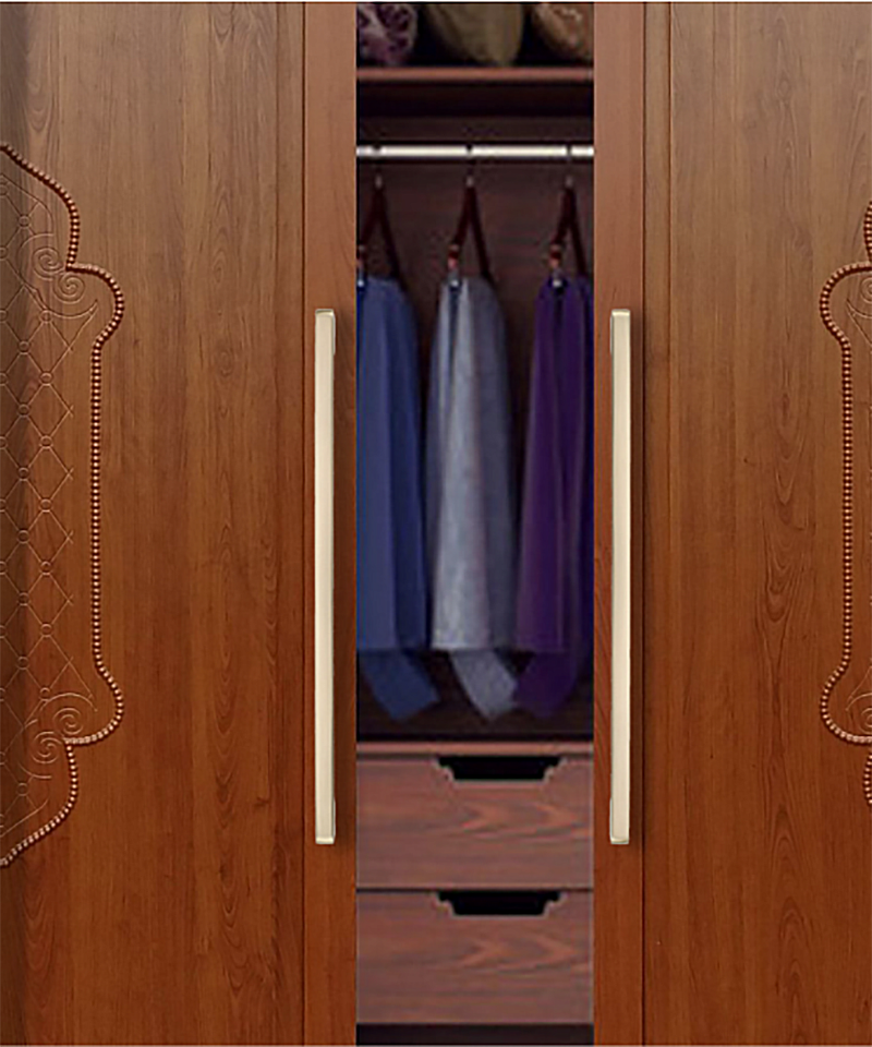 Với tủ quần áo kịch trần, việc lắp đặt các thanh tay nắm dài 320mm màu Vàng đồng dọc theo cánh tủ sẽ tạo hiệu ứng thị giác giúp tủ trông cao hơn và sang trọng như các showroom thời trang cao cấp.