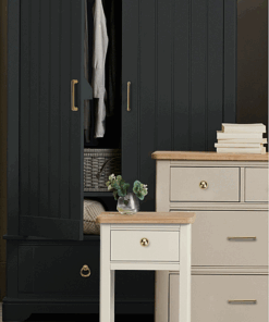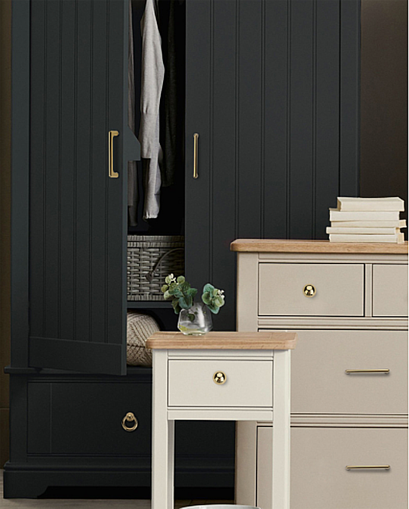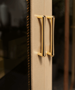 Tủ quần áo (Wardrobe): Tay nắm mạ vàng dài chạy dọc cánh tủ áo không chỉ giúp đóng mở dễ dàng mà còn như một đường viền trang trí, giúp cánh tủ bớt đơn điệu.